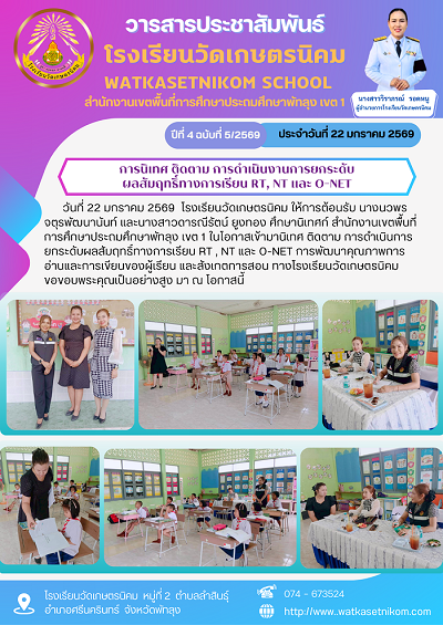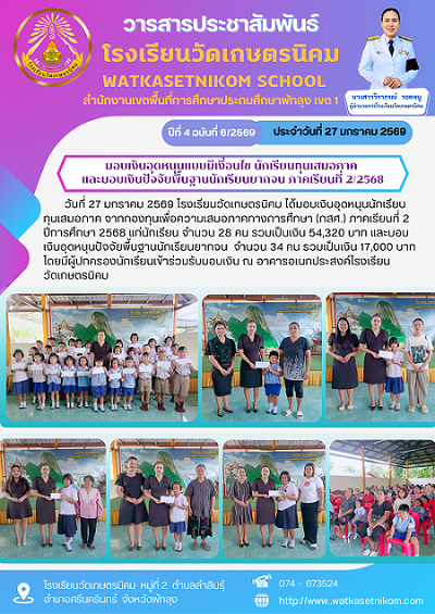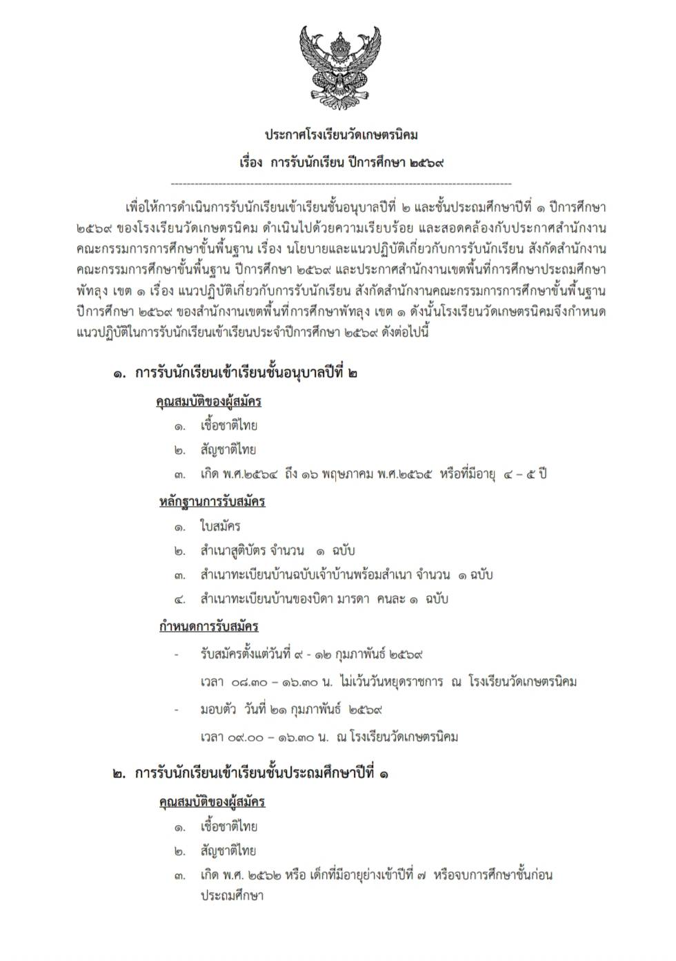 ประกาศโรงเรียนวัดเกษตรนิคม เรื่อง การรับนักเรียน ปีการศึกษา 2569 รายละเอียดดังนี้